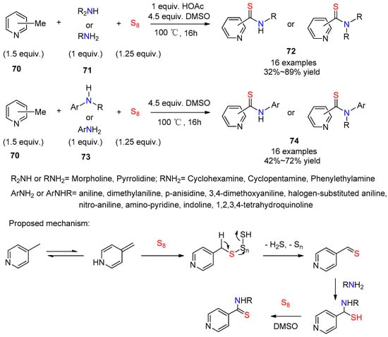 - Nguyen, T.T.T.; Ngo, Q.A.; Koleski, M.; Nguyen, T.B. The catalytic role of elemental sulfur in the DMSO-promoted oxidative coupling of methylhetarenes with amines: Synthesis of thioamides and bis-aza-heterocycles. Org. Chem. Front. 2021, 8, 1593–1598. [Google Scholar] [CrossRef]