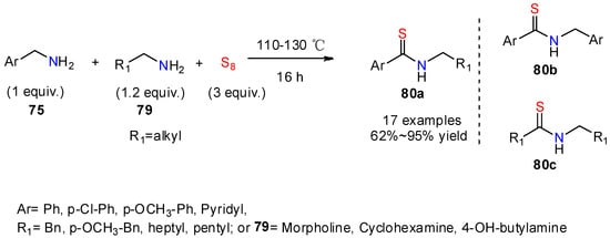 - Li, X.; Pan, Q.; Hu, R.; Wang, X.; Yang, Z.; Han, S. S8-mediated one-pot synthesis of thioamides from benzyl chlorides and amines. Asian J. Org. Chem. 2016, 5, 1353–1358. [Google Scholar] [CrossRef]