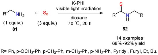 - Saito, M.; Murakami, S.; Nanjo, T.; Kobayashi, Y.; Takemoto, Y. Mild and chemoselective thioacylation of amines enabled by the nucleophilic activation of elemental sulfur. J. Am. Chem. Soc. 2020, 142, 8130–8135. [Google Scholar] [CrossRef]