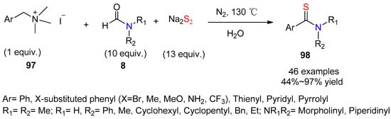 - Zhou, Z.; Yu, J.-T.; Zhou, Y.; Jiang, Y.; Cheng, J. Aqueous MCRs of quaternary ammoniums, N-substituted formamides and sodium disulfide towards aryl thioamides. Org. Chem. Front. 2017, 4, 413–416. [Google Scholar] [CrossRef]