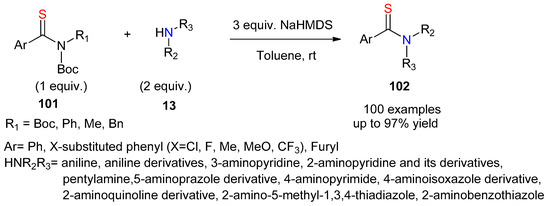 In the same trend, Szostak and co-workers reported in 2022 a simple and direct method for transamidation of N-tert-butoxycarbonyl aryl thioamides 101 based on the uncommon cleavage of the C(S)-N bond under mild conditions [71]. This process occurred well in the presence of NaHMDS, whereas other bases (NaOH, KO-t-Bu, n-BuLi) were found ineffective in this reaction (Scheme 42). This protocol is broadly compatible with different functional groups, thus offering an interesting alternative for the construction of substituted thioamides.