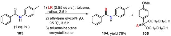 Regarding P4S10 and Lawesson’s reagent, which often produce toxic phosphor-containing aqueous chemical wastes and require tedious procedures, some improved work-ups have been proposed. Recently, Hu and co-workers [74] developed an efficient work-up for their thionation reactions with LR by a treatment of ethylene glycol (Scheme 43) which avoided purification by column chromatography and the generation of phosphor-containing aqueous waste.