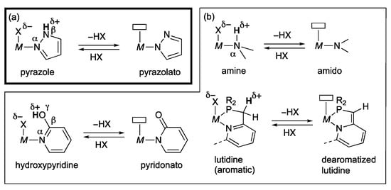 (a) Elimination and addition of pronucleophiles HX in pyrazole complexes. (b) Representative examples of related metal–ligand cooperative interconversion.