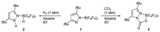 Coordination of a pyrazole to a Lewis acidic metal center renders the pyrazole NH proton more acidic []. The increased Brønsted acidity causes intra- and intermolecular hydrogen bonding as well as facile deprotonation that switches the coordination mode from a lone-pair donating L-type to a covalent X-type. These events should make an electronic impact on the complex. It is to be emphasized that the deprotonation in the position β to the metal may be coupled with ligand dissociation on the metal center. As illustrated in Scheme 1a, elimination of HX or outer sphere transfer of nucleophilic group X along with a proton from such a “β-protic” pyrazole complex would yield a coordinatively unsaturated pyrazolato complex. Bond cleavage of pronucleophile HX on this complex regenerates the pyrazole complex. The interconversion associated with change in the coordination mode of the pyrazole rather than the formal oxidation state of the metal would mediate various bond activation and transfer of HX. Such metal–ligand cooperative transformations have also been known for related proton-responsive ligands [,,,,,,,,,], exemplified in Scheme 1b. Nevertheless, difference in ligand acidity and relative positions to the metal center in the protic pyrazole complexes brings about their unique reactivities. Tamm and co-workers demonstrated that the pyrazolylborane 1 reacts with dihydrogen gas at room temperature to afford the zwitterionic pyrazolium borate 2 (Scheme 2) []. Heterocumulenes, such as carbon dioxide, also react with 1 to give the corresponding adduct 3, for example []. These reactions showcase the pyrazole-based bifunctional reactivities operating even in the field of transition-metal-free, frustrated Lewis pair chemistry.