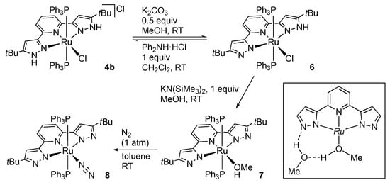Soon after that, our group demonstrated that the deprotonation can be done stepwise and reversible at least in the first step []. Thus, the ruthenium(II) complex 4b having a tert-butyl substituted pincer ligand, tBuLH2, undergoes reversible deprotonation by equimolar amount of a base to afford the pyrazole–pyrazolato complex 6 (Scheme 4). The partial deprotonation of the pincer ligand is established by the 1H NMR spectrum of 6, showing the D2O-exchangeable NH resonance at δ 10.17 with only 1H intensity as well as inequivalence of the two pyrazole arms. The single crystal X-ray analysis allows the detailed structural comparison between the pyrazole and deprotonated pyrazolato rings. The deprotonated pyrazole group lacks neighboring hydrogen bond acceptors and features a smaller NαNβC angle (106.8(4)°) due to the increased s character of the lone pair electrons on the deprotonated nitrogen atom [,]. Complete deprotonation of the pyrazole arms is achieved by an additional base in methanol, giving the bis(pyrazolato) methanol complex 7. In the crystal of 7, a hydrogen bonding network involving a co-crystalized methanol is observed (inset). The methanol ligand in 7 is replaced by molecular nitrogen and oxygen to yield the dinitrogen complex 8 and a side-on peroxo complex, respectively.