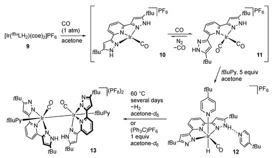 Goldberg and co-workers reported the reactivities of the iridium(I) complex [Ir(tBuLH2)(coe)2]PF6 (9; coe = cyclooctene) bearing labile coe ligands (Scheme 5) []. The coe ligands are easily displaced by carbon monoxide, giving the bis(carbonyl) complex 11 featuring κ2-coordination of the tBuLH2 ligand. When 11 is dissolved in acetone-d6 under N2, a monocarbonyl species 10 having equivalent pyrazole arms is observed, suggesting an equilibrium between 10 and 11. Addition of 4-tert-butylpyridine (tBuPy) to 11 results in an oxidative addition of one of the two pyrazole NH groups to afford the hydridoiridium(III) pyrazolato complex 12. Co-crystallization of an additional pyridine, which is engaged in hydrogen bonding with the pyrazole arm of the tBuLH ligand, has been confirmed by X-ray analysis. Deprotonation of 12 affords the bis(pyrazolato) complex [IrH(CO)(tBuPy)(tBuL)]. Triphenylphosphine also reacts with the carbonyl complex 11 with oxidative addition of the pyrazole arm; however, the isolated product is [IrH(CO)(PPh3)2(tBuLH)]PF6, having a κ2-bound tBuLH ligand. Interestingly, thermolysis of 12 leads to dinuclear reductive elimination of H2 to give the diiridium(II) complex 13. Complex 13 is also formed by treatment of 12 with (Ph3C)PF6. Deprotonation of the dicationic complex 13 yields the bis(pyrazolato) complex [{Ir(CO)(tBuPy)(tBuL)}2]. Isolation of the iridium complexes ranging from Ir(I) to Ir(III) indicates the electronic flexibility of the RLHn (n = 0–2) ligands.