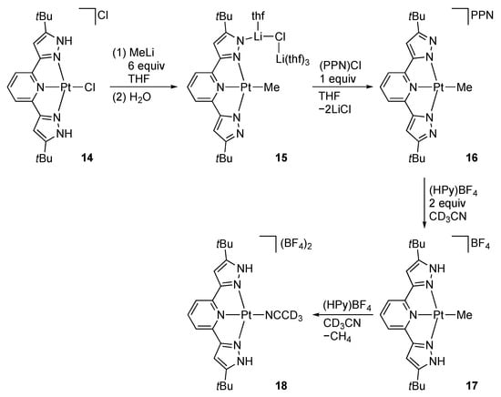 Goldberg and co-workers [] demonstrated that reaction of the chlorido complex 14 with methyllithium results in methylation of the platinum center, along with deprotonation of the tBuLH2 ligand to afford the methyl complex 15 with a dangling lithium cation on one of the two pyrazolato arms (Scheme 6). In the solution of THF-d8, the pincer ligand in 15 is symmetric, and the lithium cation is removed by the treatment with bis(triphenylphosphine)iminium (PPN) chloride to give the anionic complex 16. The methyl bis(pyrazolato) complex 16 undergoes three-step protonation with a pyridinium tetrafluoroborate. While the first protonation product is insoluble and remains uncharacterized, following protonation yields the cationic methyl complex 17 and acetonitrile complex 18 sequentially. Thus, the first site of protonation is the pyrazolato ligand rather than the Pt–Me bond. Methane release from [PtMe(tBuLH2)]Cl, a chloride salt of 17, is not observed in C6D6 until 180 °C, indicating that the high energy barrier for the intramolecular proton transfer to the methyl ligand.