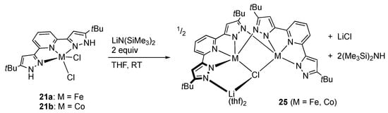 Following that, Caulton and co-workers reported dehydrochlorination of the iron(II) and cobalt(II) complexes 21 with two equiv of a lithium silylamide in THF (Scheme 8) [,]. Full dehydrochlorination is, however, not achieved, and the products are the monochlorido-bridged, anionic complexes 25. For cobalt, the reactions in diethyl ether or toluene yield single crystals of unexpected polynuclear complexes, apparently caused by partial dissociation of the tBuLH2. Complexes 25 can be regarded as lithium chloride adducts of dimers of the expected two-fold dehydrochlorination products MtBuL with coordinative unsaturation.