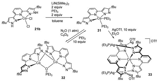 As in the case of the iron analogue 21a, dehydrochlorination of the cobalt(II) complex 21b in the presence of triethylphosphine affords the bis(phosphine) complex 31 (Scheme 10) []. Subsequent treatment with nitrous oxide results in oxidation of the phosphine ligand to yield the (phosphine oxide)-bridged dinuclear complex 32. This complex catalyzes oxidation of PEt3 and PPh3 with nitrous oxide or O2, owing to the interconversion between 31 and 32. Meanwhile, the ligand basicity of 31 was suggested by the formation of the cobalt(III) complex 33 with each pyrazolato arm binding to a silver center []. Even cooperation of Lewis acid–Brønsted base centers is proposed for the oxidation of 31 in dichloromethane to give the cobalt(III) chlorido complex 34 (Scheme 11) [].
