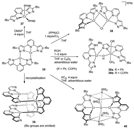 In addition, reduction of 35 with two equiv of KC8 as well as oxidation of 35 with ferrocenium cation is examined []. Recrystallization of the reaction products again results in uptake of adventitious water to produce oxido-bridged tri- and tetranuclear complexes, respectively, with ambiguous reaction stoichiometry. The reduced species is trapped with carbon dioxide to afford a carbonato-bridged, dianionic–dinuclear complex []. On the other hand, the oxidation of 35 with a quinone gives rise to the formation of a bis(semiquinone) Cr(III)2 complex [].