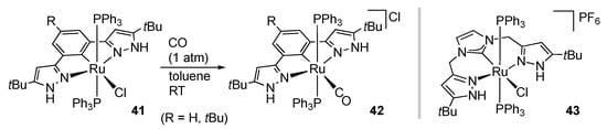 Introduction of a strong σ-donor as the central ligating atom in the protic pincer framework should affect the reactivities of the trans ligand in particular. We reported ligand substitution of the NCN pincer-type ruthenium complexes 41, which are obtained by cyclometalation of the corresponding 1,3-bis(1H-pyrazol-3-yl)benzenes (Scheme 13) []. Owing to the trans effect of the central aryl group in the pincer ligand, the substitution takes place even at room temperature to give 42, in contrast to the reaction of the NNN pincer-type analogue 4b at 100 °C with the aid of a Lewis acid []. An iridium complex, bearing this NCN pincer ligand, is also synthesized in a similar manner [].