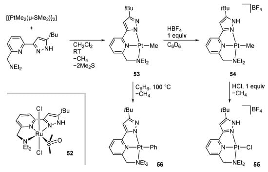A tertiary amino group can also be incorporated into the protic pincer framework to afford unsymmetrical pincer-type complexes with a hemilabile arm. After our isolation of the ruthenium(II) and iron(II) complexes, such as 52 [], Goldberg and co-workers reported the reactivities of the platinum(II) complexes bearing this unsymmetrical protic pincer ligand (Scheme 16) []. The methyl–pyrazolato complex 53, obtained from a dimethylplatinum(II) complex and the free ligand, undergoes protonation at the pyrazolato arm rather than the methyl ligand, as observed in the symmetrical bis(pyrazolato) complex 16 (vide supra). The reaction of 54 with hydrogen chloride leads to methane evolution to afford the chlorido complex 55. In contrast, intramolecular proton migration from the NH group to the methyl ligand appears more difficult. The methyl complex 54, with a deuterium-labeled NH group, releases only unlabeled CH4 after being subjected to the temperature higher than 100 °C. The absence of CDH3 generation indicates that the methane is derived from an external proton source rather than the NH group. Interestingly, heating of the methyl–pyrazolato complex 53 in benzene results in the formation of the phenyl complex 56. The reaction in C6D6 revealed concurrent site-specific deuteration of the methylene hydrogens in the ethyl groups of the pincer ligand, which implies the hemilabile nature of the dialkylaminomethyl arm.