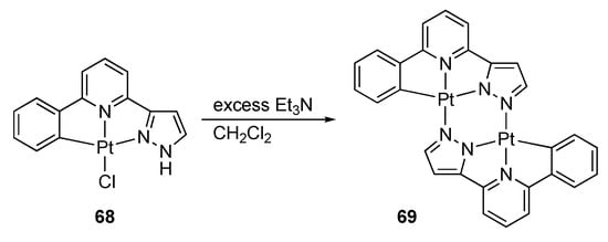 Previously, Lam and co-workers reported a CNN pincer-type pyrazole complex 68, wherein one of the two protic pyrazolyl groups in the HLH2 ligand is replaced by a phenyl group (Scheme 19) []. This complex undergoes dehydrochlorination to afford the pyrazolato-bridged dinuclear complex 69, as observed in bidentate 2-(1H-pyrazol-3-yl)pyridine complexes [,].