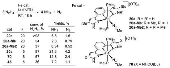 - Tanaka, H.; Hitaoka, S.; Umehara, K.; Yoshizawa, K.; Kuwata, S. Mechanistic Study on Catalytic Disproportionation of Hydrazine by a Protic Pincer-Type Iron Complex through Proton-Coupled Electron Transfer. Eur. J. Inorg. Chem. 2020, 2020, 1472–1482. [Google Scholar] [CrossRef]