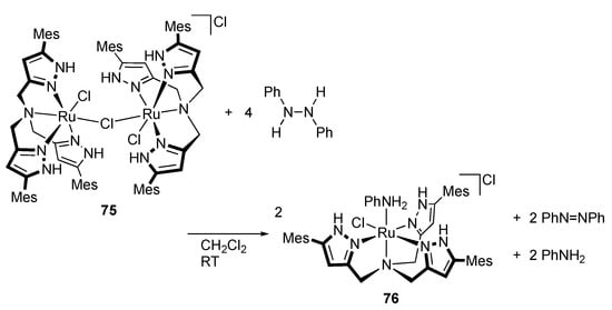 Similar disproportionation of a substituted hydrazine is reported for a triprotic, tripodal tris(1H-pyrazol-3-ylmethyl)amine complex []. Treatment of the chlorido-bridged diruthenium(II) complex 75 with 1,2-diphenylhydrazine results in N–N bond cleavage to afford the aniline complex 76 (Scheme 22) []. Concurrent formation of azobenzene along with free aniline indicates disproportionation of two moles of 1,2-diphenylhydrazine to azobenzene and two moles of aniline in this transformation. The aniline ligand in 76 is engaged in hydrogen bonding network with the protic pyrazole units along with the chloride counteranion. The disproportionation proceeds catalytically when an excess of 1,2-diphenylhydrazine is added to 75. An analogous complex of a tetradentate ligand having non-protic pyridylmethyl arms displays no catalytic activity, even in the presence of external protic pyrazole as a proton source, indicating that the proton-responsive unit in the second coordination sphere is responsible for the N–N bond cleavage.