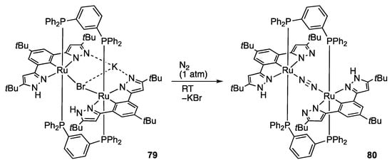 Even dinitrogen is coordinated to proton-responsive pyrazole-based complexes, as in the mononuclear tBuL complex 8 []. The NCN pincer-type dinuclear complex 79, supported by two linking diphosphine ligands, reacts with dinitrogen to afford the dinitrogen-bridged diruthenium(II) complex 80 (Scheme 24) []. Unfortunately, no further transformation of the dinitrogen ligand in this multiproton-responsive cavity has not been reported.
