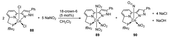 Reduction of nitrogen oxides constitutes the inorganic nitrogen cycle in nature. Better understanding of the reaction may be important to address the issue of the coastal eutrophication caused by excessive use of nitrogen fertilizer. We found that the reaction of the ruthenium(II) complex 81 with silver nitrite leads to N–O bond cleavage of the nitro anion, giving the nitrosylruthenium(II) complex 82 (Scheme 25) []. The dehydrative conversion is most likely assisted by proton transfer from the pyrazole ligand, and the overall reaction is redox neutral.