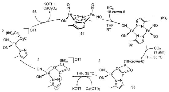- Tseng, Y.-T.; Ching, W.-M.; Liaw, W.-F.; Lu, T.-T. Dinitrosyl Iron Complex [K-18-crown-6-ether][(NO)2Fe(MePyrCO2)]: Intermediate for Capture and Reduction of Carbon Dioxide. Angew. Chem. Int. Ed. 2020, 59, 11819–11823. [Google Scholar] [CrossRef] [PubMed]