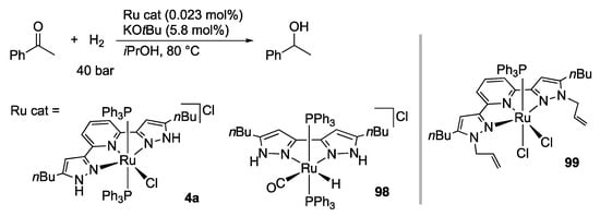 - Yoshinari, A.; Tazawa, A.; Kuwata, S.; Ikariya, T. Synthesis, Structures, and Reactivities of Pincer-Type Ruthenium Complexes Bearing Two Proton-Responsive Pyrazole Arms. Chem. Asian J. 2012, 7, 1417–1425. [Google Scholar] [CrossRef]