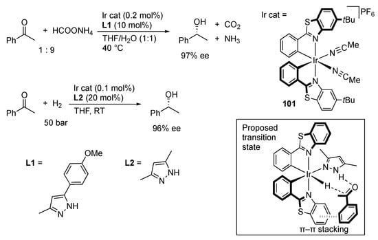 - Tian, C.; Gong, L.; Meggers, E. Chiral-at-Metal Iridium Complex for Efficient Enantioselective Transfer Hydrogenation of Ketones. Chem. Commun. 2016, 52, 4207–4210. [Google Scholar] [CrossRef]