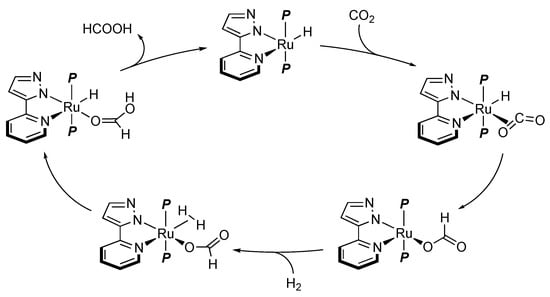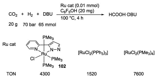 - Muller, K.; Sun, Y.; Heimermann, A.; Menges, F.; Niedner-Schatteburg, G.; van Wüllen, C.; Thiel, W.R. Structure–Reactivity Relationships in the Hydrogenation of Carbon Dioxide with Ruthenium Complexes Bearing Pyridinylazolato Ligands. Chem. Eur. J. 2013, 19, 7825–7834. [Google Scholar] [CrossRef] [PubMed]