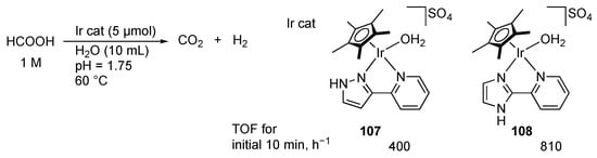 - Manaka, Y.; Wang, W.-H.; Suna, Y.; Kambayashi, H.; Muckerman, J.T.; Fujita, E.; Himeda, Y. Efficient H2 Generation from Formic Acid Using Azole Complexes in Water. Catal. Sci. Technol. 2014, 4, 34–37. [Google Scholar] [CrossRef]