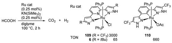 - Nakahara, Y.; Toda, T.; Matsunami, A.; Kayaki, Y.; Kuwata, S. Protic NNN and NCN Pincer-Type Ruthenium Complexes Featuring (Trifluoromethyl)pyrazole Arms: Synthesis and Application to Catalytic Hydrogen Evolution from Formic Acid. Chem. Asian J. 2018, 13, 73–80. [Google Scholar] [CrossRef]