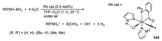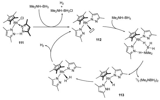 - Pal, S.; Iwasaki, T.; Nozaki, K. Metal–Ligand Cooperative κ1-N-Pyrazolate Cp*RhIII-Catalysts for Dehydrogenation of Dimethylamine-Borane at Room Temperature. Dalton Trans. 2021, 50, 7938–7943. [Google Scholar] [CrossRef]