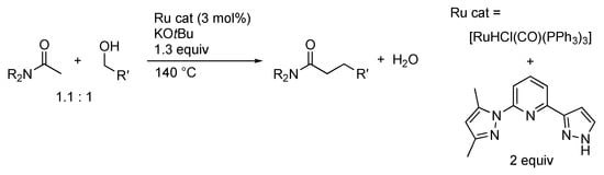 - Kuwahara, T.; Fukuyama, T.; Ryu, I. Ruthenium Hydride/Nitrogen Tridentate Ligand-Catalyzed α-Alkylation of Acetamides with Primary Alcohols. RSC Adv. 2013, 3, 13702–13704. [Google Scholar] [CrossRef]