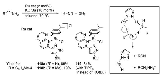 - Dutta, I.; Yadav, S.; Sarbajna, A.; De, S.; Hölscher, M.; Leitner, W.; Bera, J.K. Double Dehydrogenation of Primary Amines to Nitriles by a Ruthenium Complex Featuring Pyrazole Functionality. J. Am. Chem. Soc. 2018, 140, 8662–8666. [Google Scholar] [CrossRef] [PubMed]