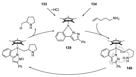 - Kashiwame, Y.; Kuwata, S.; Ikariya, T. Metal–Pyrazole Bifunction in Half-Sandwich C–N Chelate Iridium Complexes: Pyrazole–Pyrazolato Interconversion and Application to Catalytic Intramolecular Hydroamination of Aminoalkene. Chem. Eur. J. 2010, 16, 766–770. [Google Scholar] [CrossRef] [PubMed]