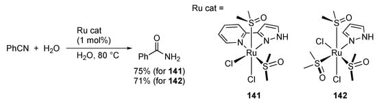 - Ferrer, Í.; Rich, J.; Fontrodona, X.; Rodríguez, M.; Romero, I. Ru(II) Complexes Containing DMSO and Pyrazolyl Ligands as Catalysts for Nitrile Hydration in Environmentally Friendly Media. Dalton Trans. 2013, 42, 13461–13469. [Google Scholar] [CrossRef] [PubMed]