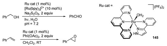 - Manrique, E.; Fontrodona, X.; Rodríguez, M.; Romero, I. A Ruthenium(II) Aqua Complex as Efficient Chemical and Photochemical Catalyst for Alkene and Alcohol Oxidation. Eur. J. Inorg. Chem. 2019, 2019, 2124–2133. [Google Scholar] [CrossRef]