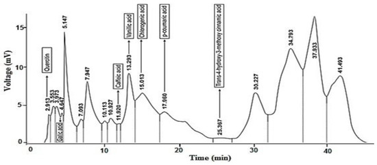 HPLC analysis: The significant hypoglycemic, hypolipidemic and anti-glycation potential was shown by ethyl acetate fraction of the plant, so HPLC was performed to discover its phenolic constituents (Table 2 and Figure 1). The compounds detected included Trans-4-hydroxyl,3-methoxy cinnamic acid, quercetin, gallic acid, caffeic acid, vanillic acid, chlorogenic acid and p-coumeric acid.