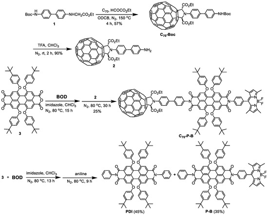 - Zhu, S.-E.; Liu, K.-Q.; Wang, X.-F.; Xia, A.-D.; Wang, G.-W. Synthesis and properties of axially symmetrical rigid visible light-harvesting systems containing [60]fullerene and perylenebisimide. J. Org. Chem. 2016, 81, 12223–12231. [Google Scholar] [CrossRef]