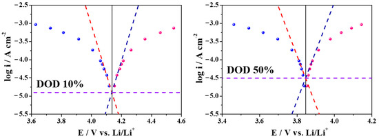 Figure 4 and Figure S2 show the Tafel plots of the NCM622-Li6PS5Cl system at 10% DOD to the 90% DOD with a 20% step width; in Figure 4 only 10% DOD and 50% DOD are shown; Figure S2 shows the 30%, 70%, and 90% DOD. The microcavity electrode is used to quantitively evaluate the transfer parameters by confining the active material and electrolyte in the microcavity. The results obtained from the Tafel plots of the present study are shown in Figure 4, and the electrochemical kinetic parameters were calculated. An exchange current density (i0) was estimated by measuring points forming a straight line with a slope of −αF/2.3RT (=Tafel line) [20].