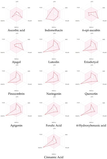 The bioavailability radar enables a glimpse of a molecule’s drug-likeliness with the pink-highlighted area as the optimal range for each property: FLEX for the flexibility of the molecule as per rotatable bonds (≤9 bonds), SIZE for the size as the molecular weight (between 150–500 g/mol), POLAR for polarity as per the topological polar surface area (between 20–130 Å2), INSOLU for insolubility in water by log S (≤6), and INSATU for saturation as per fraction of carbons in the sp3 hybridization (≥0.25) [].