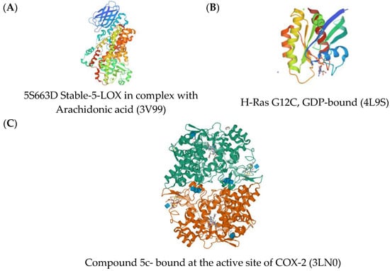 Three-dimensional crystal structures of (A) 5S663D Stable-5-LOX in complex with Arachidonic acid (3V99); (B) H-Ras G12C, GDP-bound (4L9S); (C) compound 5c-S bound at the active site of COX-2 (3LN0).