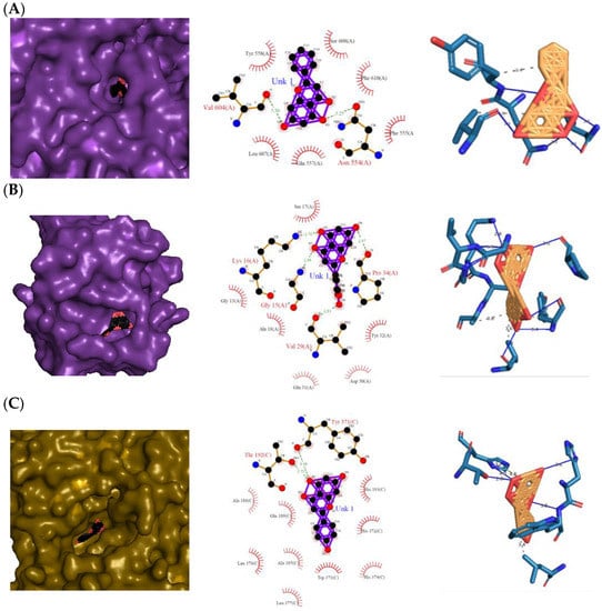 The 3D and 2D diagrams of the top ligand docked on the active site for each protein are shown in Figure 5. Pinocembrin’s O3 and O4 atoms only contributed to two H bonds with the backbones of the LOX-5 protein (3V99) (Figure 5A): Asn 554(A) and Val 604(A), respectively. However, pinocembrin hydrophobically interacted with six amino acid residues: Tyr 558(A), Ser 608(A), Phe 610(A), Phe 555(A), Gln 557(A), and Leu 607(A), causing a free-binding energy of −11.29 kcal mol−1 (Table 2), despite the complex having only two H bonds. On the other hand, the following atoms of eriodictyol contributed to H bonds with the backbones of H-Ras signaling protein (4L9S) (Figure 5B): one from the O2 atom with Gly 15(A), one from the O3 atom with Lys 16(A), one from the O4 atom with Pro 34(A), and one from the O6 atom with Val 29(A), while the ligand hydrophobically interacted with the Ser 17(A), Gly 13(A), Ala 19(A), Glu 31(A), Tyr 32(A), and Asp 30(A) of the protein. For the COX-2 protein (3LN0) (Figure 5C), naringenin was found to be the top-scored ligand with a −11.96 kcal mol−1 atom O3 contributing to two H bonds with Tyr 371(C) and Thr 192(C), and hydrophobic interactions with Ala 188(C), Glu 189(C), Leu 376(C), Ala 185(C), Leu 377(C), Trp 373(C), His 374(C), His 372(C), and His 193(C). Arginine, tryptophan, leucine, and alanine were some of the precursors for an innate inflammatory response while starvation or reduction of reserved amino acids such as tyrosine, histidine, and glutamine on signaling proteins activated certain downstream pathways and upregulation of autophagy which results in the restriction of inflammation [].