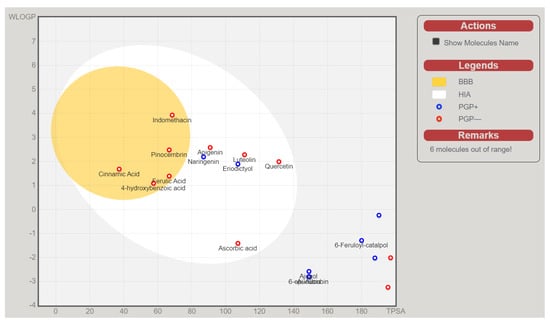 The above-presented data indicate that naringenin, pinocembrin, and eriodictyol are potential inhibitors of the inflammation and oxidation pathways’ target proteins. Without the high-HIA compounds (Figure 6), the rest of the identified compounds from C. cujete fell out of the BBB and HIA range, predicting their inability for absorption and brain penetration which was also the basis of these compounds to be disregarded for the succeeding in silico analysis. It was also observed that among the compounds with a high probability of passive absorption and brain penetration, only the eriodictyol and naringenin were predicted as actively effluxed by P-gp (PGP+) while the rest were predicted as non-substrates of P-gp (PGP−) [].