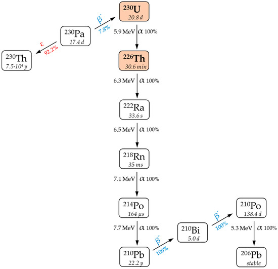Scientific organizations worldwide are actively developing the production of 230U through irradiation of 232Th with protons [9,10,11,12,13]. This method has proven to be the most effective in terms of product yield compared with the reactions with deuterons [14,15]. Moreover, the maximum of the 232Th(p,3n)230Pa reaction excitation function is around 20 MeV [15,16], which enables up-scaled production of 230U on accessible commercial cyclotrons. At higher proton energies (>100 MeV), 230U can be obtained as a byproduct in 225Ac production [17,18] along with 223Ra [19].