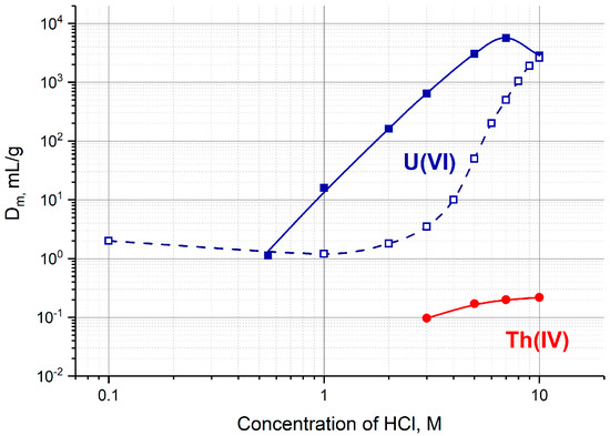 The mass distribution ratios Dm, mg/mL, of U(VI) and Th(IV) on TEVA resin (solid lines) [31] and Dowex 1 × 10 (dashed line) [33] as a function of HCl concentration.