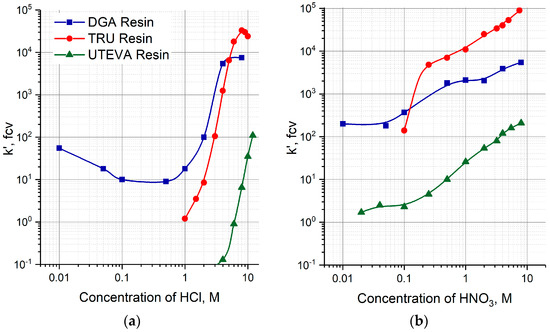 Capacity factors k′, fcv, of Th(IV) on DGA, TRU and UTEVA resins as a function of HCl (a) and HNO3 (b) concentrations [37,38,39].