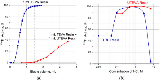 (a) Optimization of the UTEVA resin volume in the second column; (b) efficiency of 226Th desorption from TRU and UTEVA columns as a function of HCl concentration.