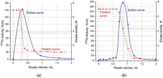Typical 226Th elution and titration curves. (a) Elution of 226Th from TRU resin with 1 M HCl; (b) elution of 226Th from UTEVA resin with 0.2 M HCl.