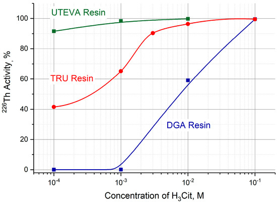 After transferring 226Th from the parent column to a second one containing TRU, UTEVA or DGA resin, 226Th can be desorbed with a neutral citric buffer solution. The efficiency of 226Th desorption was studied as a function of H3Cit (pH 5.0) concentration in the range of 10−4 M–10−1 M. The dependencies plotted on the graph (Figure 7) are arranged in the order reflecting the above-mentioned sequence of resin affinity for thorium (IV). For the studied resins, 0.1 M citric buffer solution fully recovered 226Th.