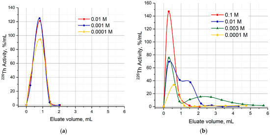 Moreover, the influence of the contact time was evaluated in parallel experiments that included the 3 M HNO3 pre-treatment of the UTEVA column, the HCl substitution with 0.15 M NaNO3 solution, and the 226Th elution with a 10−3 M citric buffer solution. As the pre-treatment duration increased from 10 min to 10 h, the efficiency of 226Th production decreased from 70% (see in Figure 11a) to zero. The behavior of the UTEVA resin may be explained by the fact that the k′ Th(IV) dependence in nitric solutions is higher than the hydrochloric solutions over the entire concentration range (Figure 3).