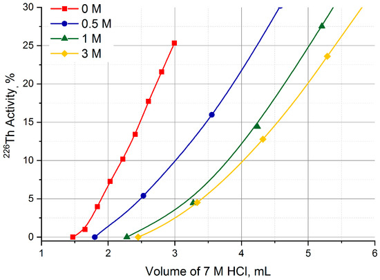 Starting from these data obtained in static conditions, the UTEVA column was pre-treated with a HNO3 solution of various concentrations and 226Th losses during Step 1 were studied. The results presented in Figure 9 display that the 226Th losses when transferring from the TEVA column to UTEVA one with 7 M HCl solution noticeably diminished along with increasing the concentration of HNO3 used for UTEVA pre-treatment. For 3 M HNO3 solution, the breakthrough of 226Th began after passing not less than 2.5 mL of 7 M HCl.