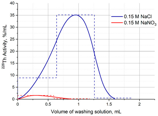 The other part of the second column modification was carried out after Step 1 and involved substituting the 7 M HCl medium with dilute or neutral one. Solutions of 0.1 M HNO3, 0.15 M NaCl, and 0.15 M NaNO3 were studied. Full change in medium in the DGA column took place after passing 1.0–1.2 mL of each solution, and 226Th losses did not exceed 3%. In the case of TRU column, 226Th was partially washed out on the HCl concentration gradient (similar to Figure 6a) regardless of the substituting solution, its losses ranged from 10% to 40% and were poorly reproducible. The UTEVA resin retained 226Th well when the solutions of 0.1 M HNO3 and 0.15 M NaNO3 were passed through the second column, whereas the 0.15 M NaCl solution washed out up to 28% of 226Th (Figure 10).