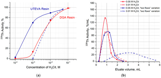 (a) Efficiency of 226Th desorption from the pre-treated DGA and UTEVA resin columns as a function of citric acid concentration (pH 5.0). DGA resin column pre-treated with 0.1 M HNO3 (red solid curve); UTEVA resin: Pre-treated with 3 M HNO3 (blue solid curve), pre-treated with 3 M HNO3 + “two flows” variation of 226Th transfer (blue dashed curve); (b) curves of 226Th elution depending on the variations of 226Th recovery from UTEVA columns.